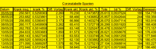 Wenn ich jetzt die Zahlen aus meiner Statisik der offiziellen Zahlen nehme, waren bisher 0,572% oder 272.646 Menschen in Spanien an dem Virus erkrankt, also bestätigt per PCR-Test. Wie dann jetzt 5% Antikörper haben können, bleibt Regierungsgeheimnis. Zumal diese 0,572% Prozent ja auch nur die bis jetzt insgesamt Infizierten sind. Die Verstorbenen, 0,0573% oder 27.321 Menschen haben natürlich auch Antikörper gebildet gehabt. Nimmt man dann die 186.480 Menschen 0,391% der offiziell Genesenen 0,0573% und zählt die zu den Verstorbenen kommt man auch nicht ganz auf 5%. Bleibt nur: das kommt mir spanisch vor. Immerhin kommt in dem Prozentsatz der Genesenen eine fünf vor.